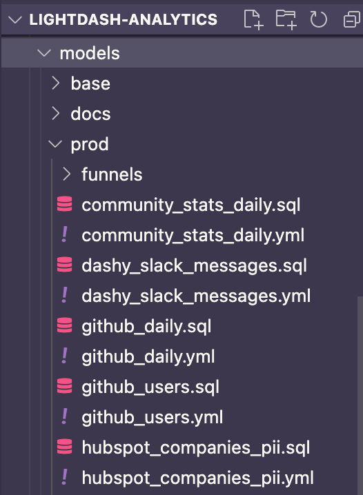 We recommend structuring your dbt project with one .yml file per model (or .sql file). We’ve found that this makes it easier to navigate through your .yml files and easier to manage your dbt models, especially as your project becomes bigger. Here’s an example of our dbt project at Lightdash too see what that looks like in practice:- We have one